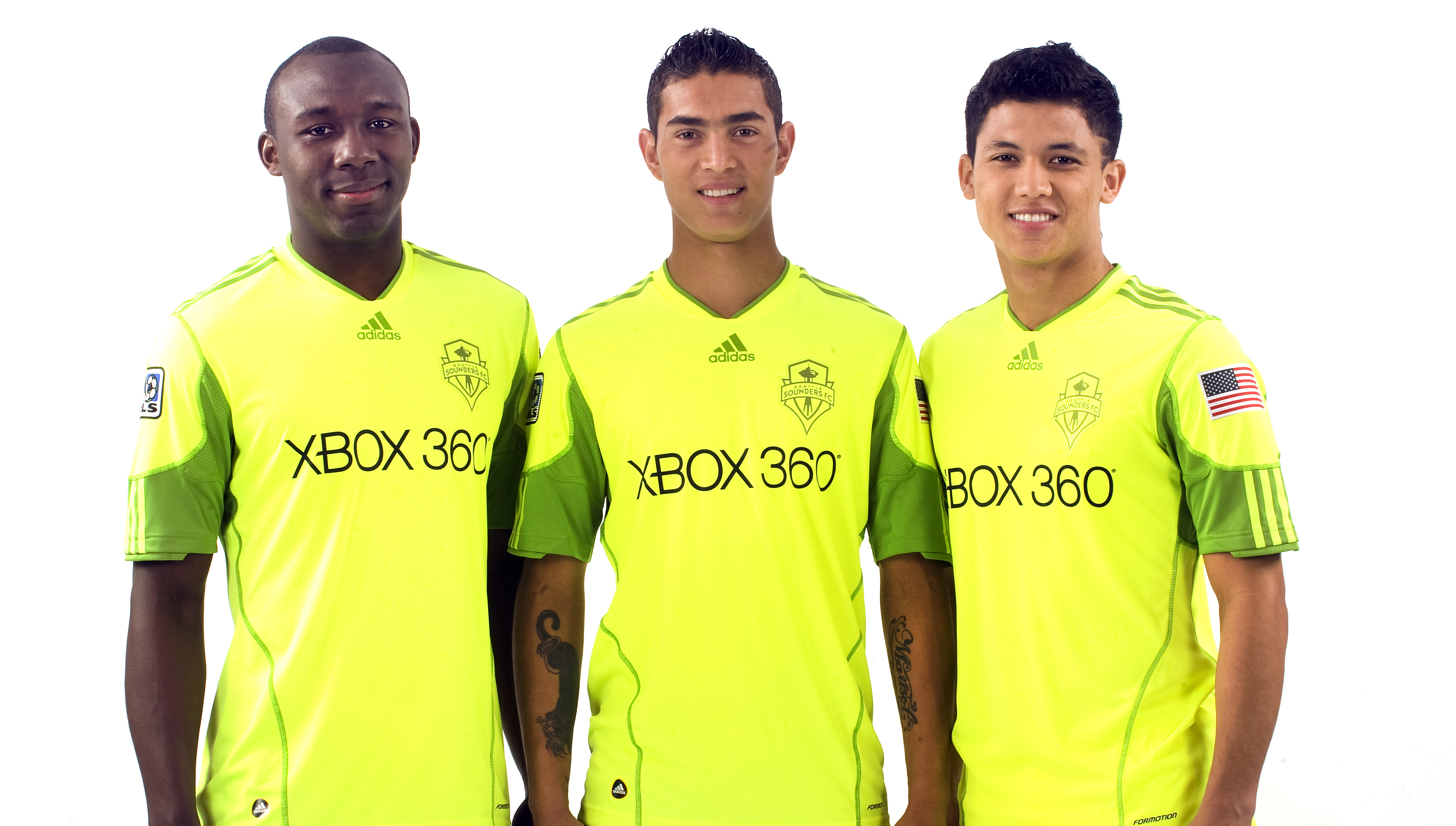 Allí están los tres colombianos del Sounders FC, luciendo una prueba viviente de que si se puede diseñar una camiseta de color más intenso y difícil de asimilar, que el famoso “Verde Radiante” que debutó en MLS el año pasado.
