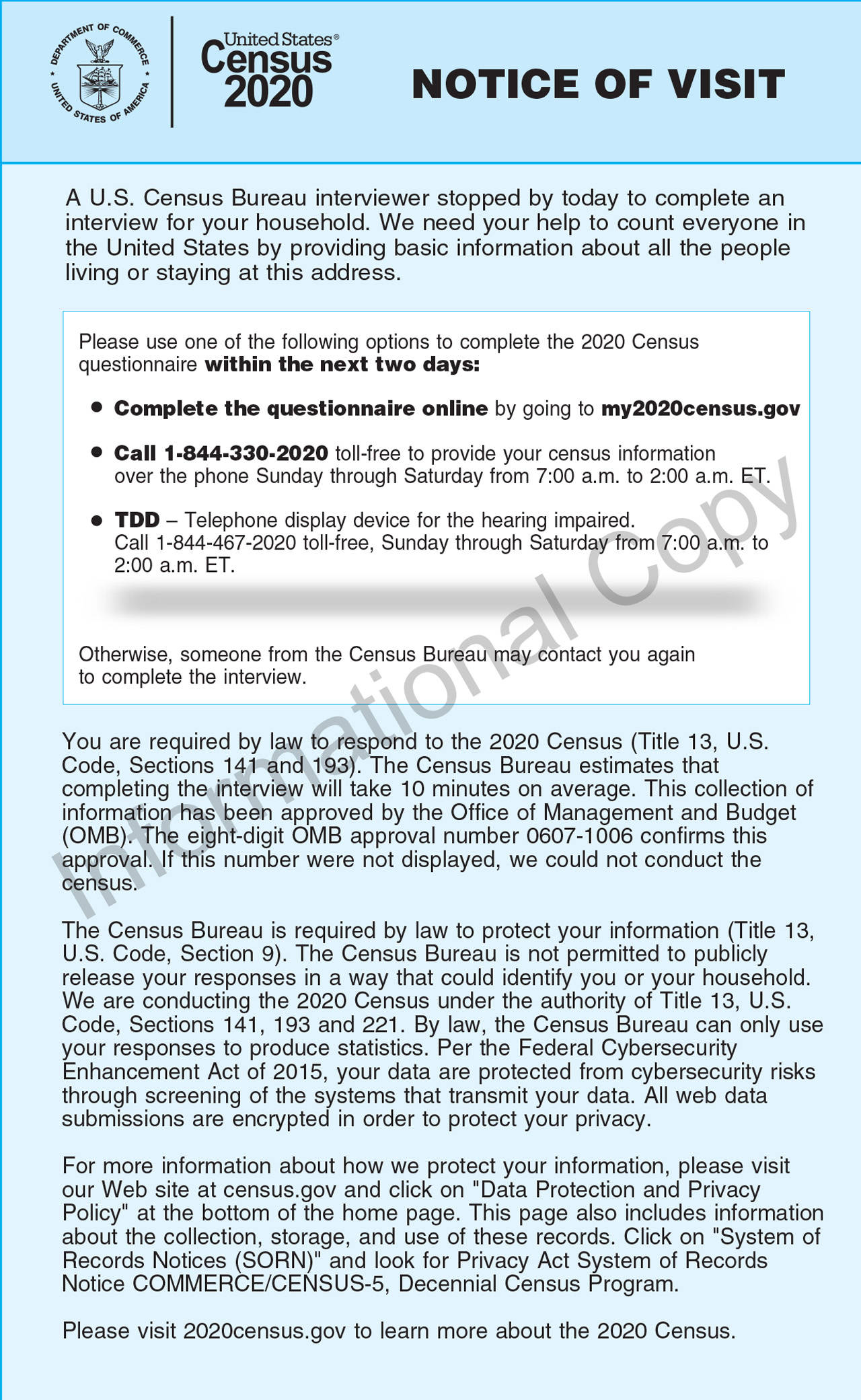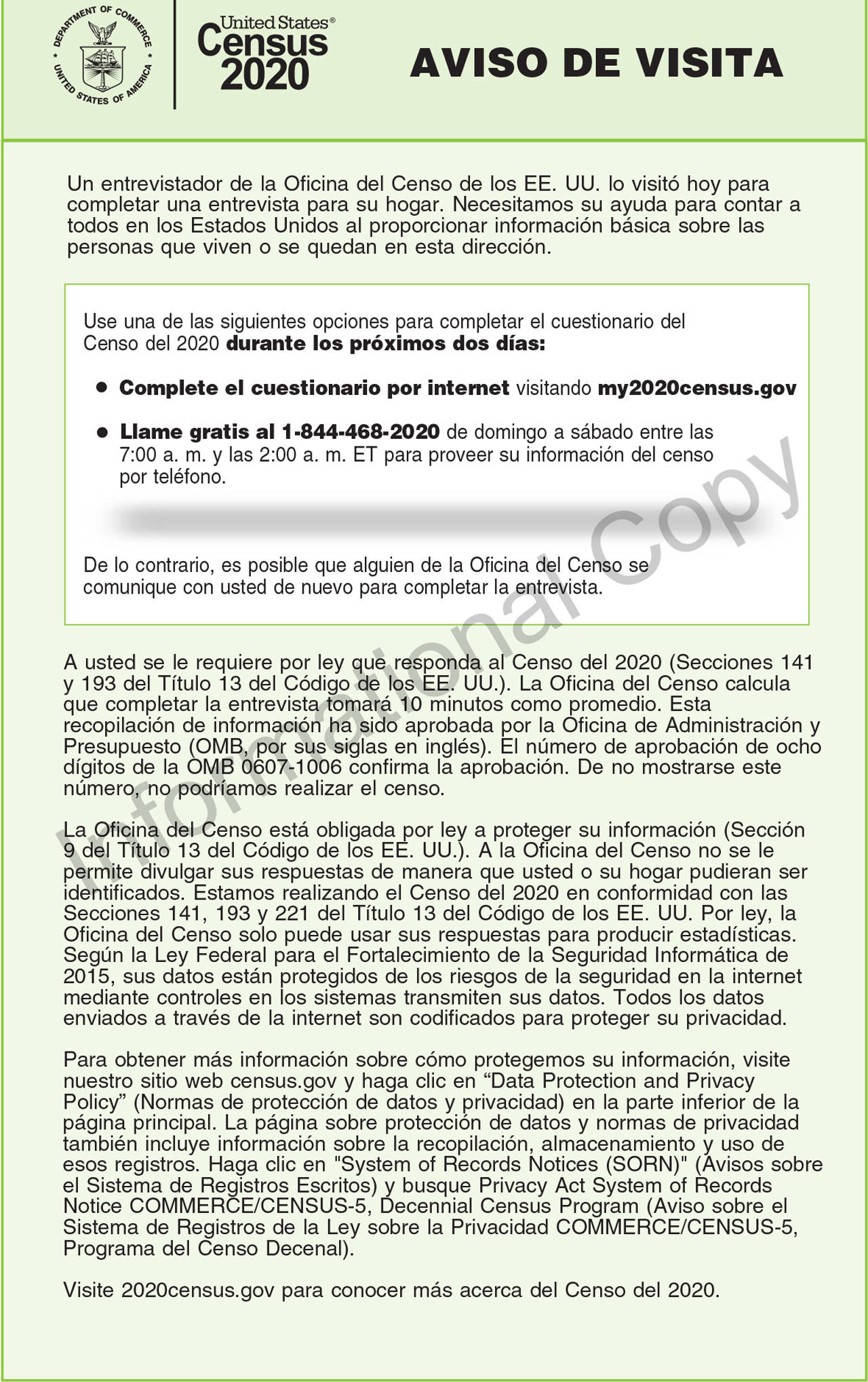 Si no hay nadie en el hogar cuando el censista lo visite, este dejará un aviso de visita con información acerca de cómo responder por internet, por teléfono o por correo. Se anima a las personas a cooperar con los censistas y a asegurar que sean contadas todas las personas que estaban viviendo en su hogar el 1 de abril de 2020.