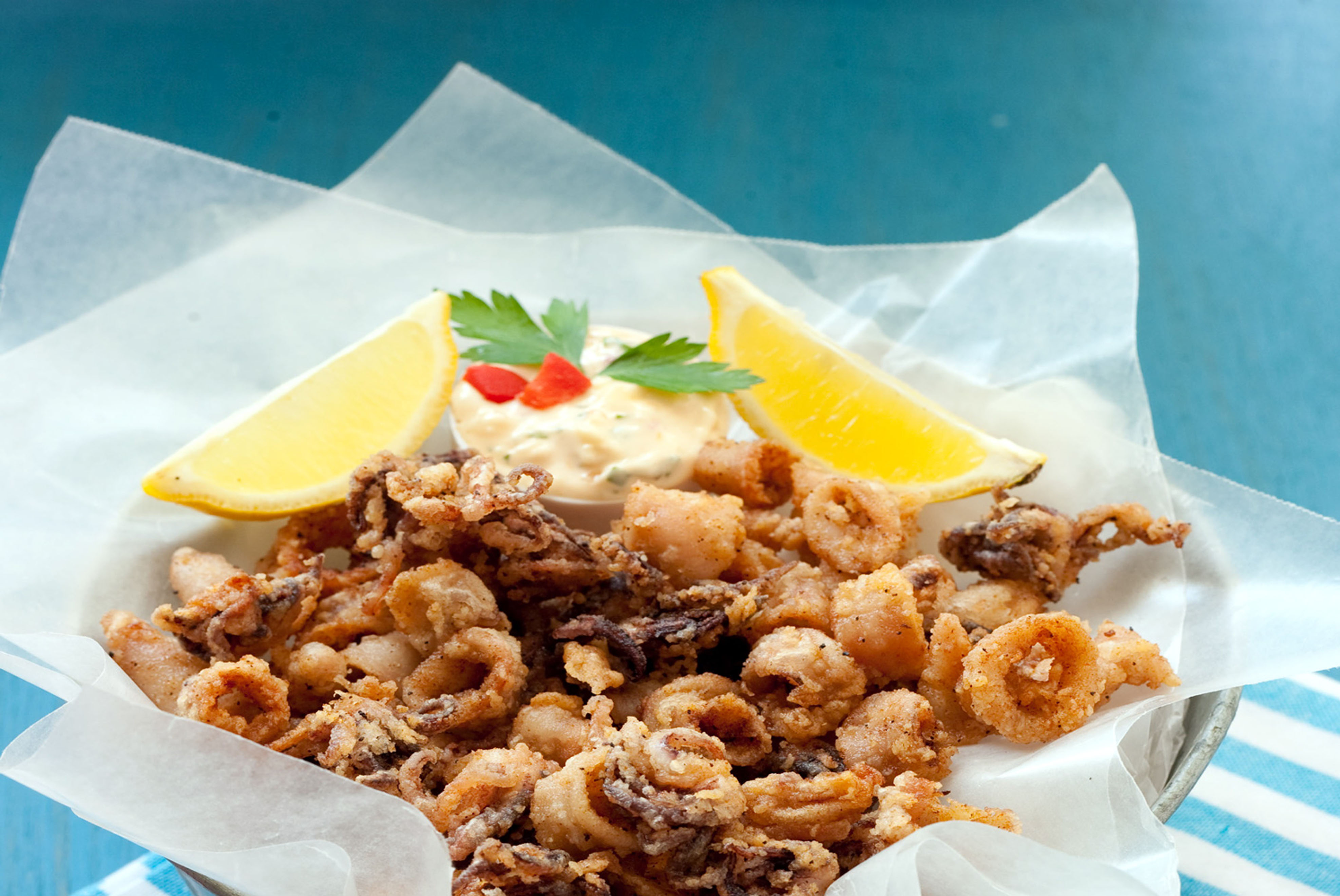 Por otro lado, mezclar la harina, pimienta, páprika y sal, enharinar el calamar y retirar el exceso con un colador.