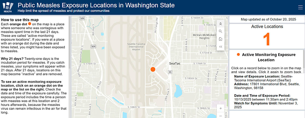 OLYMPIA. El DOH (por su sigla en inglés, Departamento de Salud del Estado de Washington) creó una nueva herramienta en línea para consultar las posibles zonas de exposición al sarampión en el estado. El rastreador de zonas de exposición al sarampión (solo en inglés) muestra los lugares públicos por los que pasaron personas con sarampión en etapa de contagio activo. El 13 de octubre de 2025, un turista con sarampión confirmado pasó por el SEA (por su sigla en inglés, Aeropuerto Internacional de Seattle-Tacoma). Esta herramienta ayuda a las personas a determinar si pudieron estar expuestas a esta enfermedad y a tomar las medidas preventivas adecuadas.