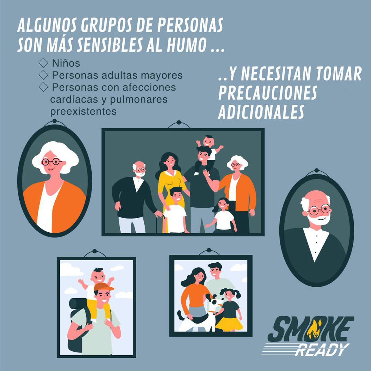 El humo de los incendios puede dar lugar a niveles peligrosos de calidad del aire, especialmente para las personas con enfermedades crónicas como el asma o la EPOC, los niños y las niñas, las personas adultas mayores, las comunidades de bajos ingresos o marginadas y más. La exposición a partículas finas procedentes del humo de incendios forestales puede irritar los ojos, la nariz y la garganta, y provocar fatiga, dolores de cabeza, sibilancia y otros síntomas.