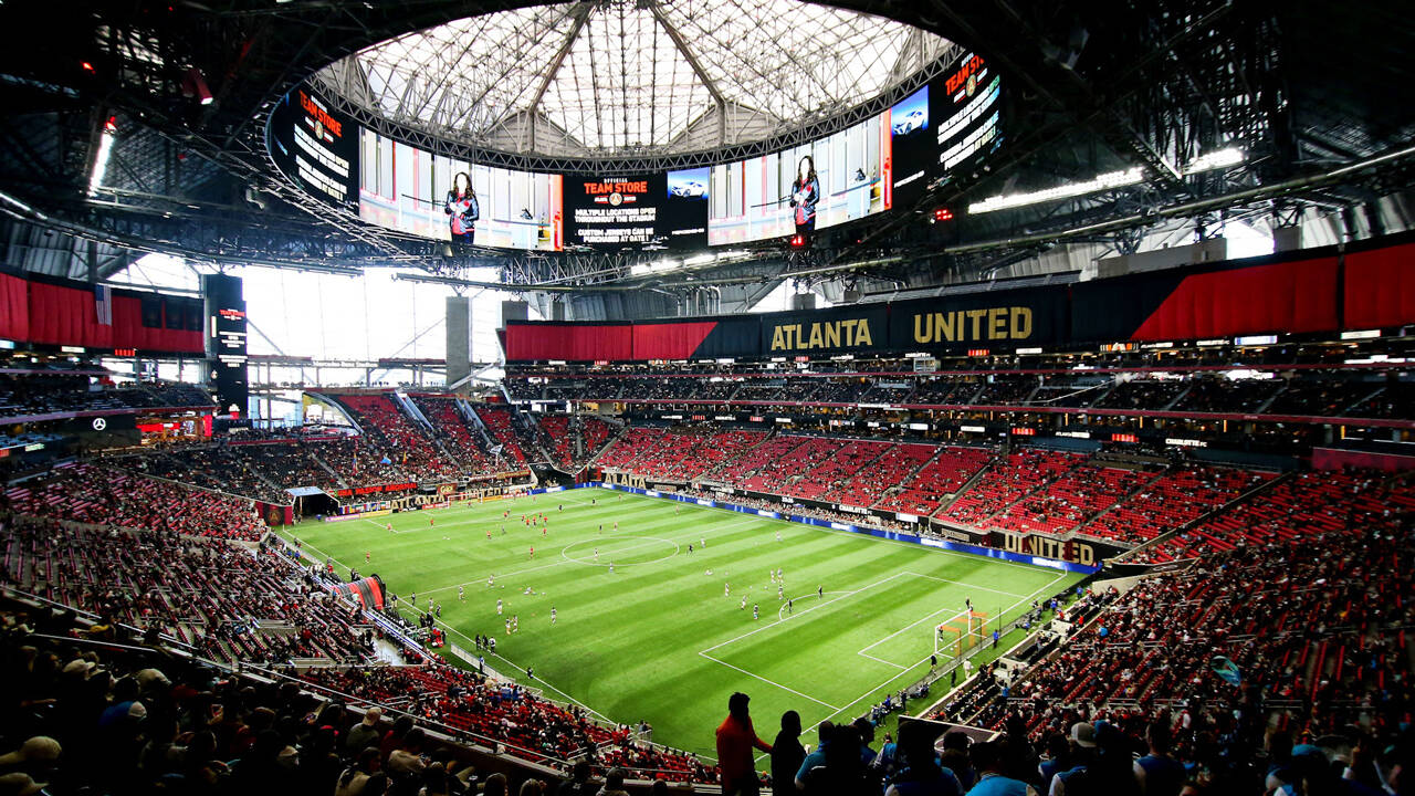 Conoce el Mercedes-Benz Stadium , la imponente casa del Atlanta United. Este inmueble Inaugurado en agosto de 2017 cuenta con un techo totalmente retráctil que se abre y se cierra como la apertura de una cámara.