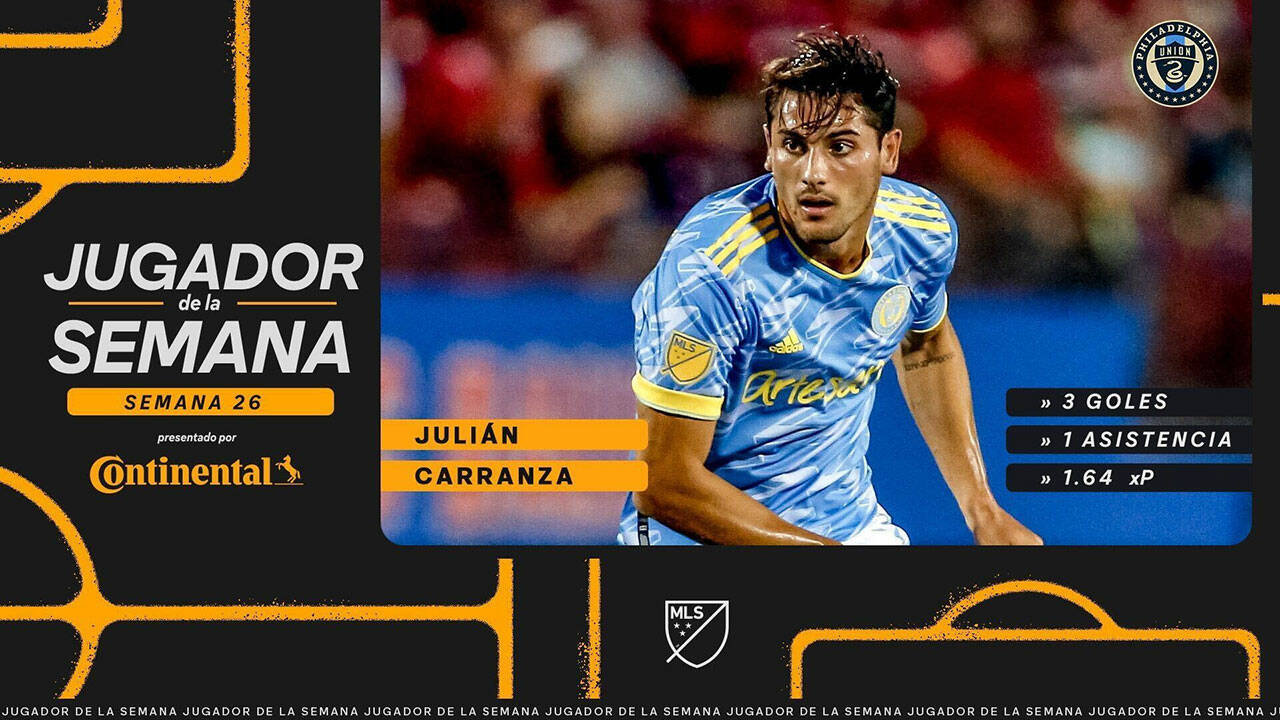 El delantero de Philadelphia Union, Julián Carranza, fue elegido como Jugador de la Semana de la Major League Soccer presentado por Continental Tire correspondiente a la semana 26 de la temporada 2022 de la MLS tras anotar su segundo triplete de la temporada contra D.C. United y sumar una asistencia en la victoria de Philadelphia por 6-0 el sábado, 20 de agosto.