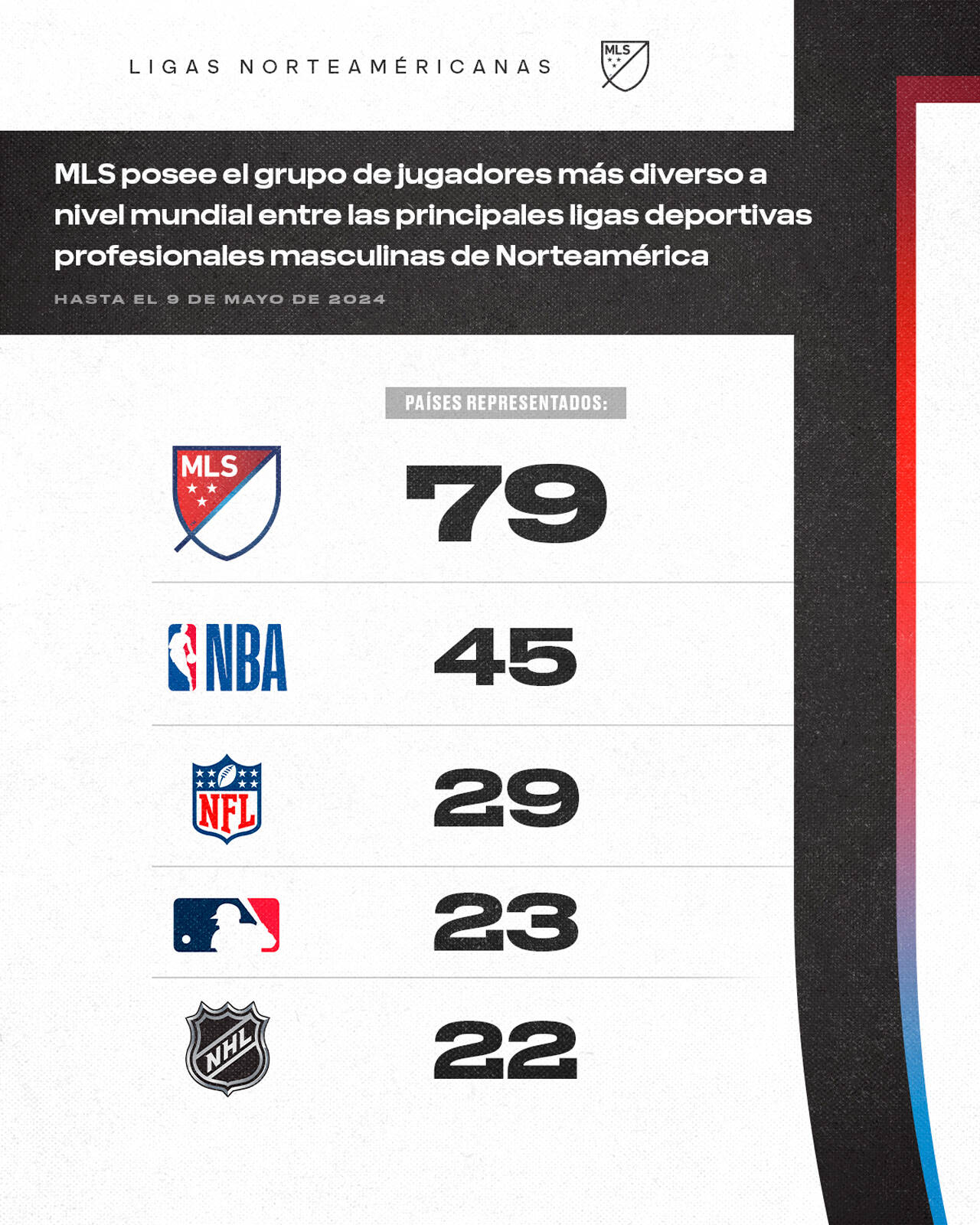 El número de países representados en la MLS en 2024 casi duplica al de la siguiente liga masculina más cercana de Norteamérica (NBA, 45 países representados) y el total es mayor que el de NFL (29), la MLB (23) y la NHL (22) combinadas.