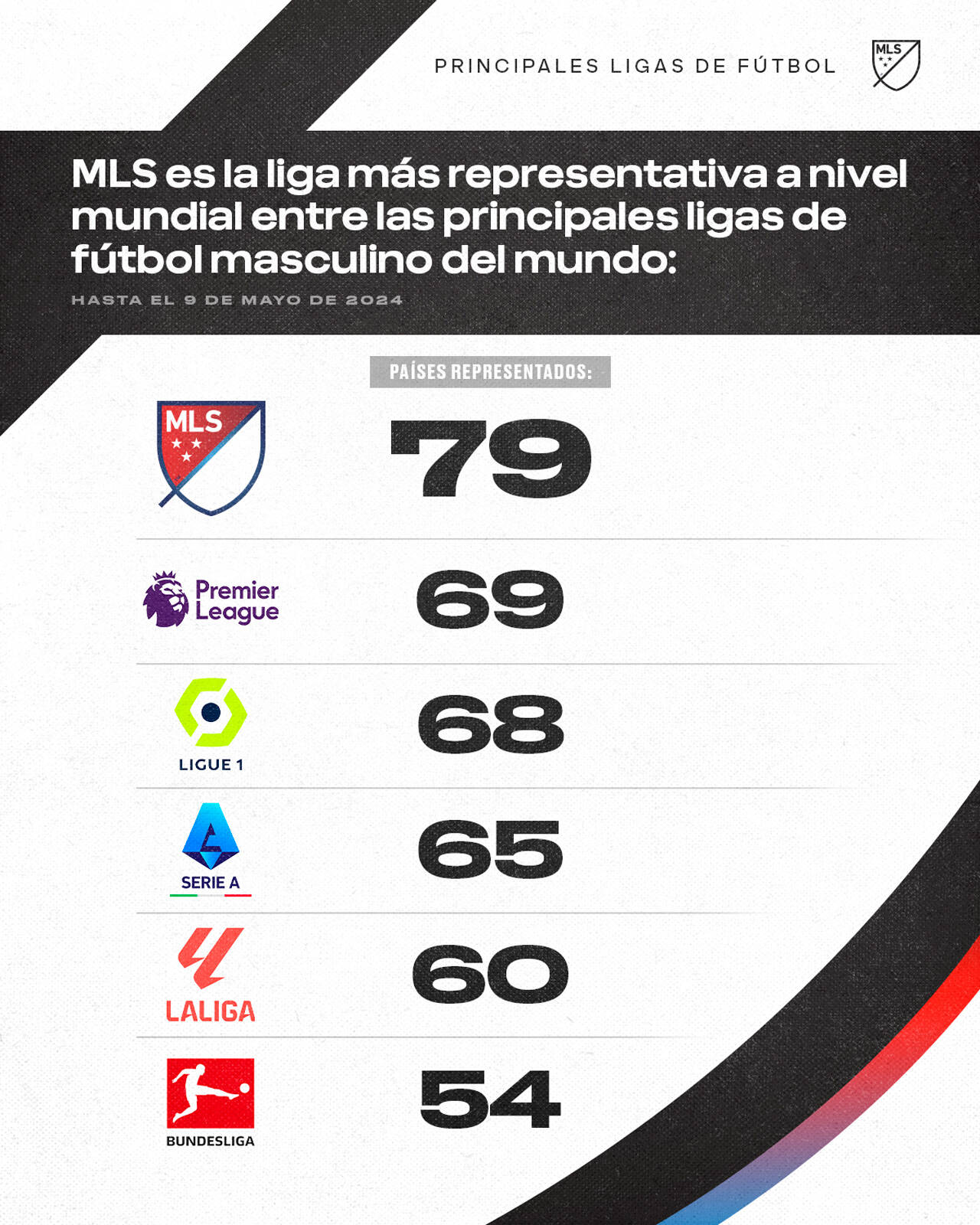 Más allá de Norteamérica, la MLS sigue siendo la liga más representativa a nivel mundial entre las principales ligas de fútbol masculino del mundo, incluyendo la Premier League inglesa (69 países representados), la Ligue 1 de Francia (68), la Serie A de Italia (65), La Liga de España (60) y la Bundesliga de Alemania (54).