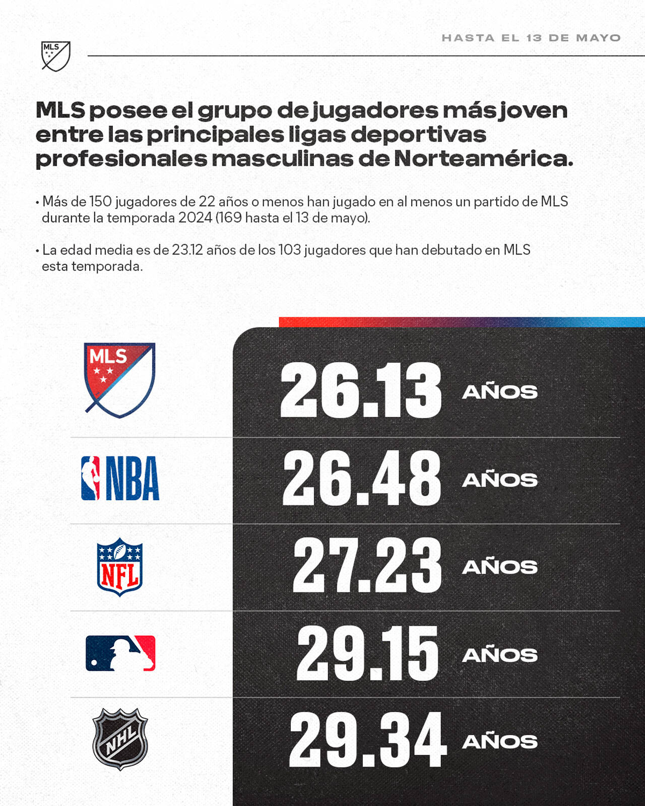 Hasta el 13 de mayo, la edad promedio de los jugadores en las nóminas de la MLS era de 26.13 años, también la más joven entre las cinco principales ligas deportivas masculinas de Norteamérica. La NBA es la siguiente liga más cercana con 26,48 años, seguida de la NFL (27.23), la MLB (29.15) y la NHL (29.34).