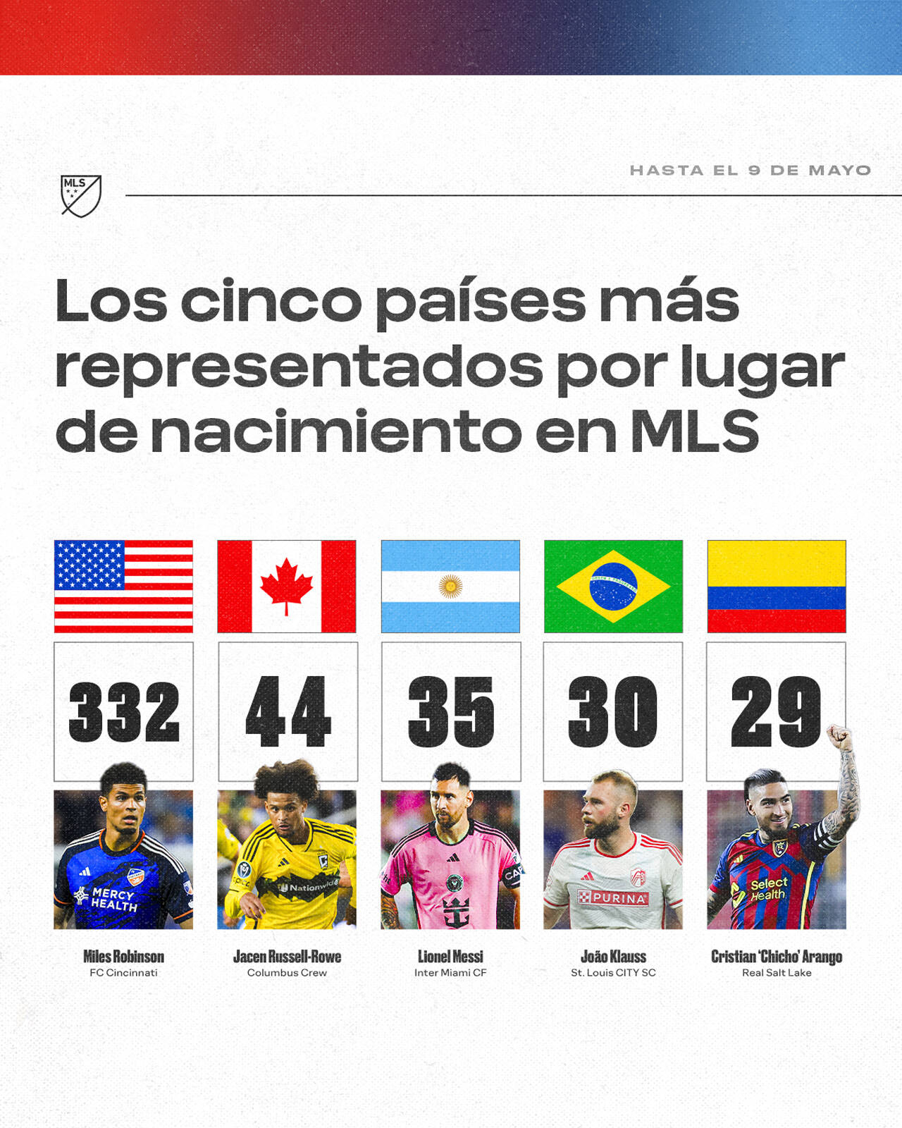 - Con 35 jugadores, incluyendo a los campeones mundiales con la Selección Argentina Thiago Almada (Atlanta United) y Lionel Messi (Inter Miami CF), Argentina ha contribuido con la mayor cantidad de jugadores nacidos fuera de Estados Unidos y Canadá por tercer año consecutivo. Brasil (30) y Colombia (29) completan los cinco primeros puestos.
