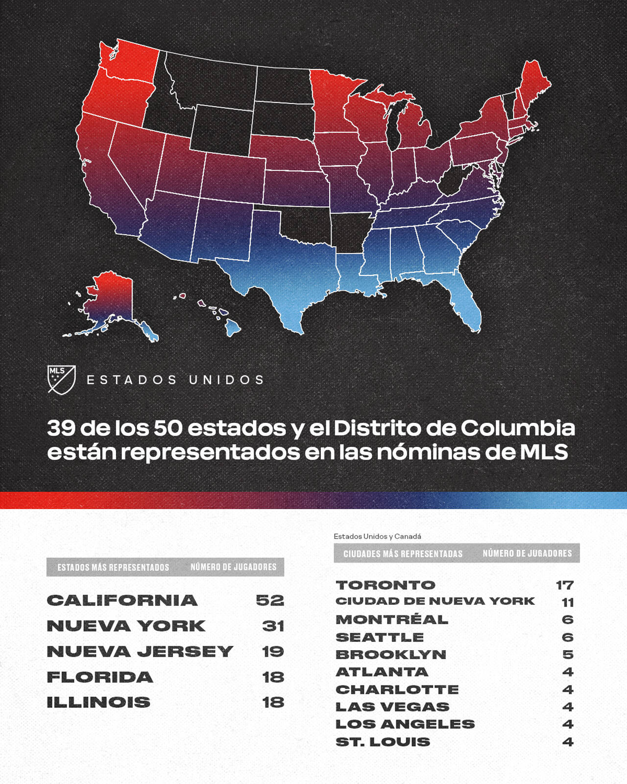 - Liderados por 52 jugadores nacidos en el estado de California, 39 de los 50 de Estados Unidos y el Distrito de Columbia están representados en las nóminas de la MLS. Después de California está el estado de Nueva York, que cuenta con 31 jugadores en MLS, con Nueva Jersey (19), Florida (18) e Illinois (18) completando los cinco primeros. Doce estados cuentan con 10 o más jugadores en las nóminas de la MLS.