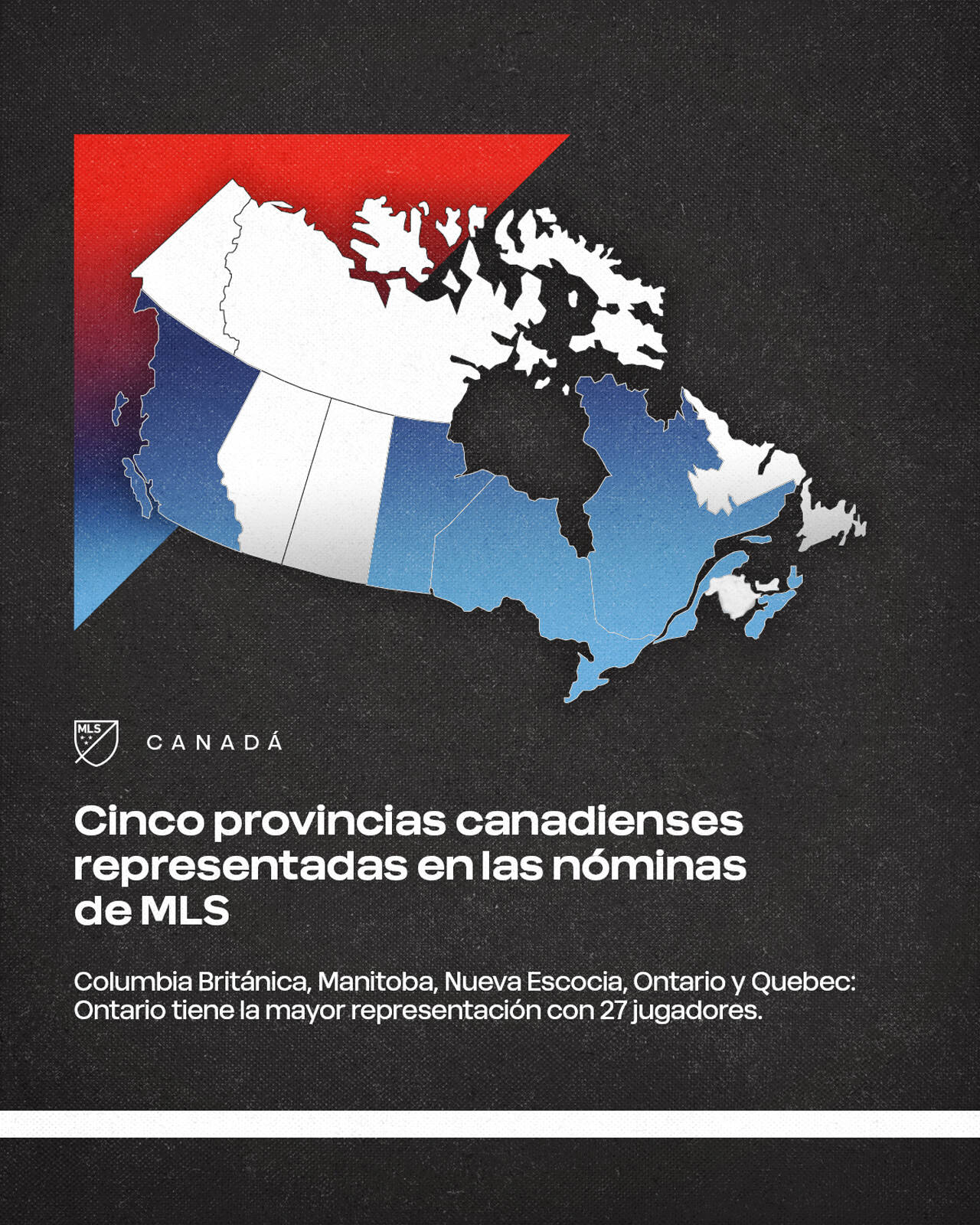 - Cinco provincias canadienses figuran en las nóminas de la MLS: Columbia Británica, Manitoba, Nueva Escocia, Ontario y Quebec, siendo Ontario la que tiene la mayor representación con 27 jugadores. Diecisiete jugadores de la MLS nacieron en Toronto, la mayor cantidad de cualquier ciudad canadiense, y Montreal le sigue con seis jugadores.