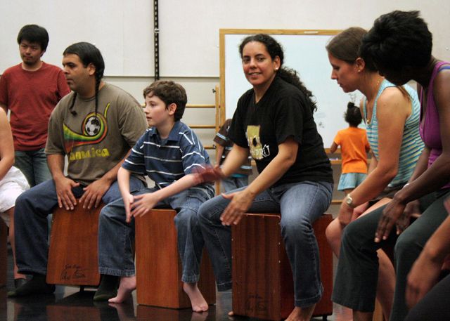 La clase atrajo alrededor de 30 personas, la mayoria miembros comunitarios junto con sus hijos. Mientras los adultos se sentaban sobre sus cajónes para aprender más ritmos, sus hijos tocaban sus mini-cajónes.