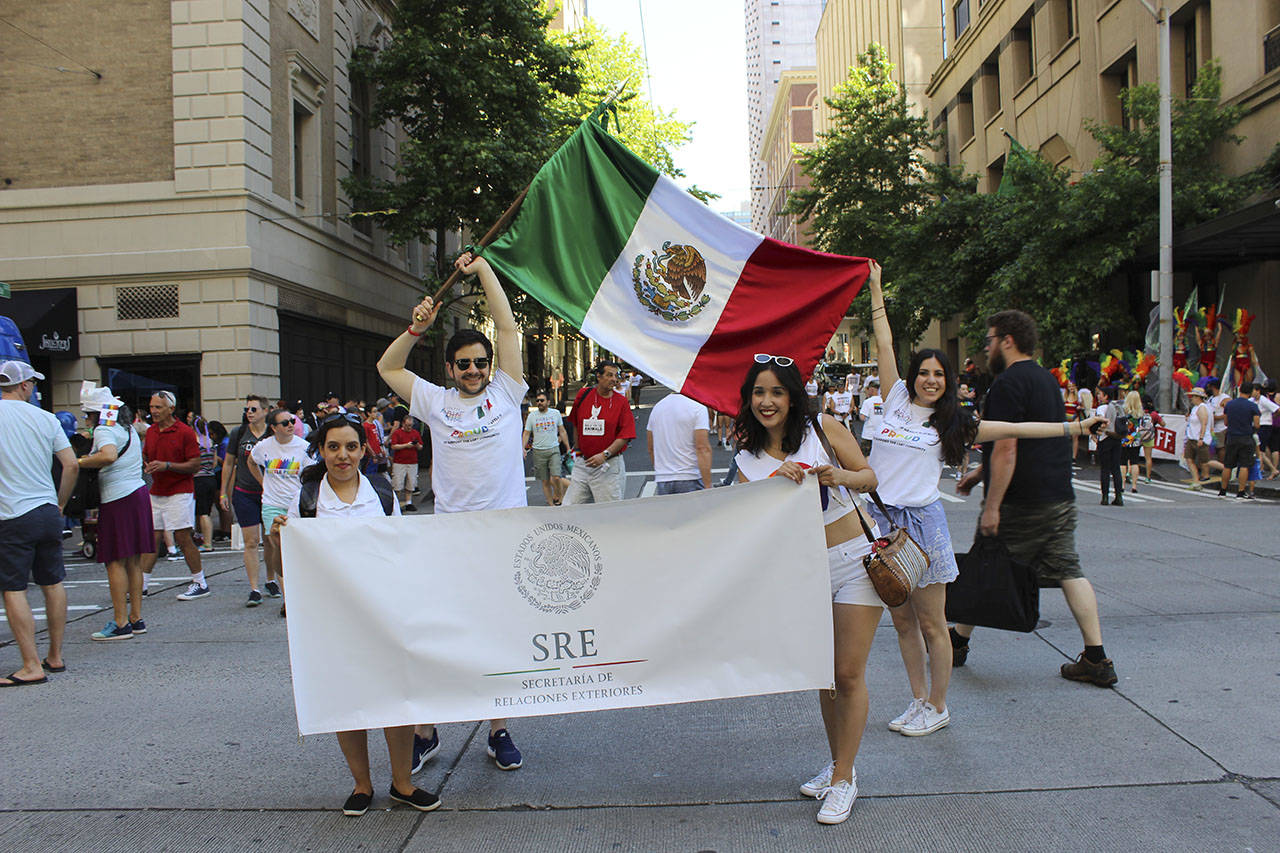 Seattle.- El pasado domingo 25 de junio se realizó el 43° Seattle Pride Parade. A pesar del calor que superó los 90°F, asistieron alrededor de 200,000 personas, de acuerdo con las cifras difundidas por la ciudad. Por primera vez, el Consulado de México en Seattle, identificado por una bandera tricolor, participó en Seattle Pride, con un contingente conformado por aproximadamente 20 personas, el cual incluyó personal del Consulado, familiares y miembros de la comunidad mexicana.