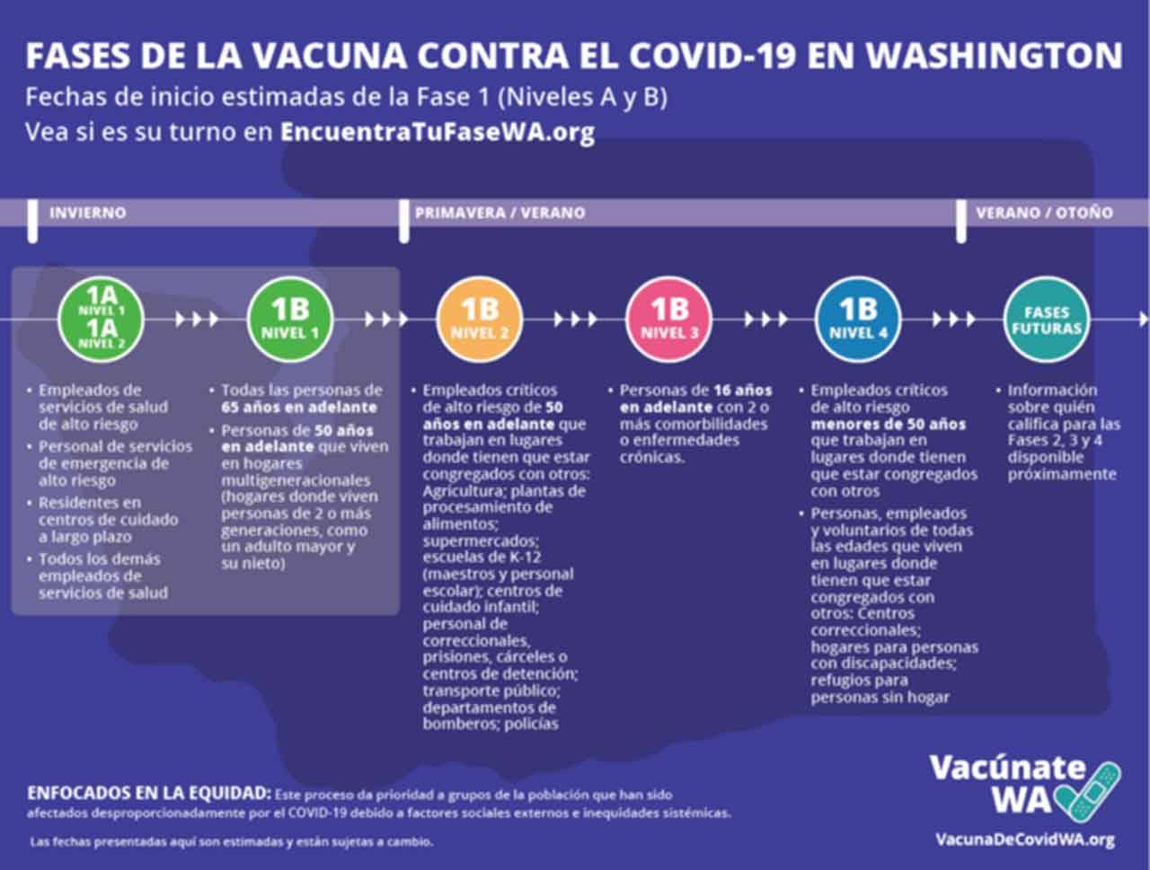 El 18 de enero, 2021, el gobernador Jay Inslee anunció que Washington está pasando a la siguiente fase de distribución de vacunas COVID-19: el nivel 1 de la fase 1B.